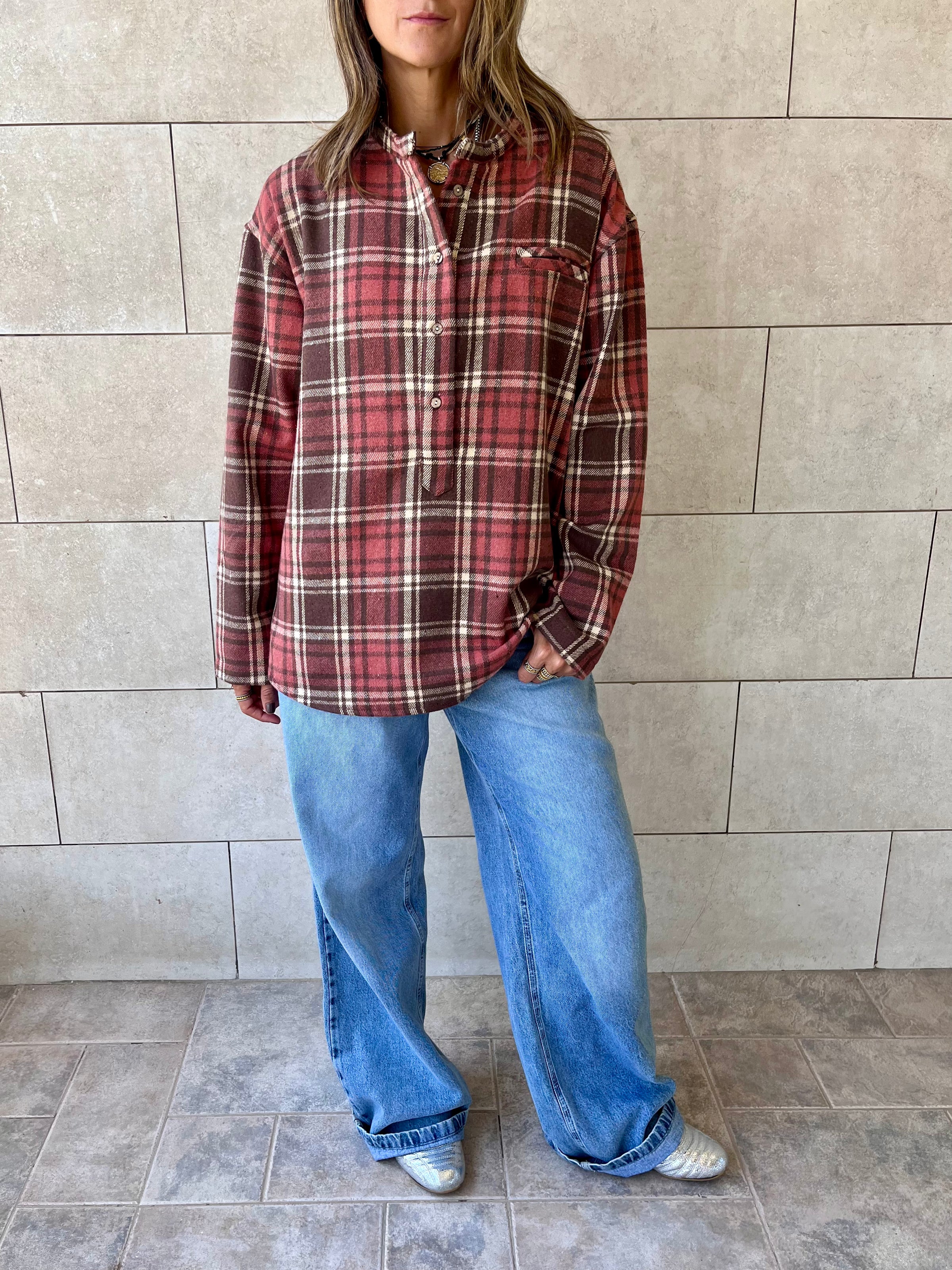 Burgundy Plaid Button Down Henley
