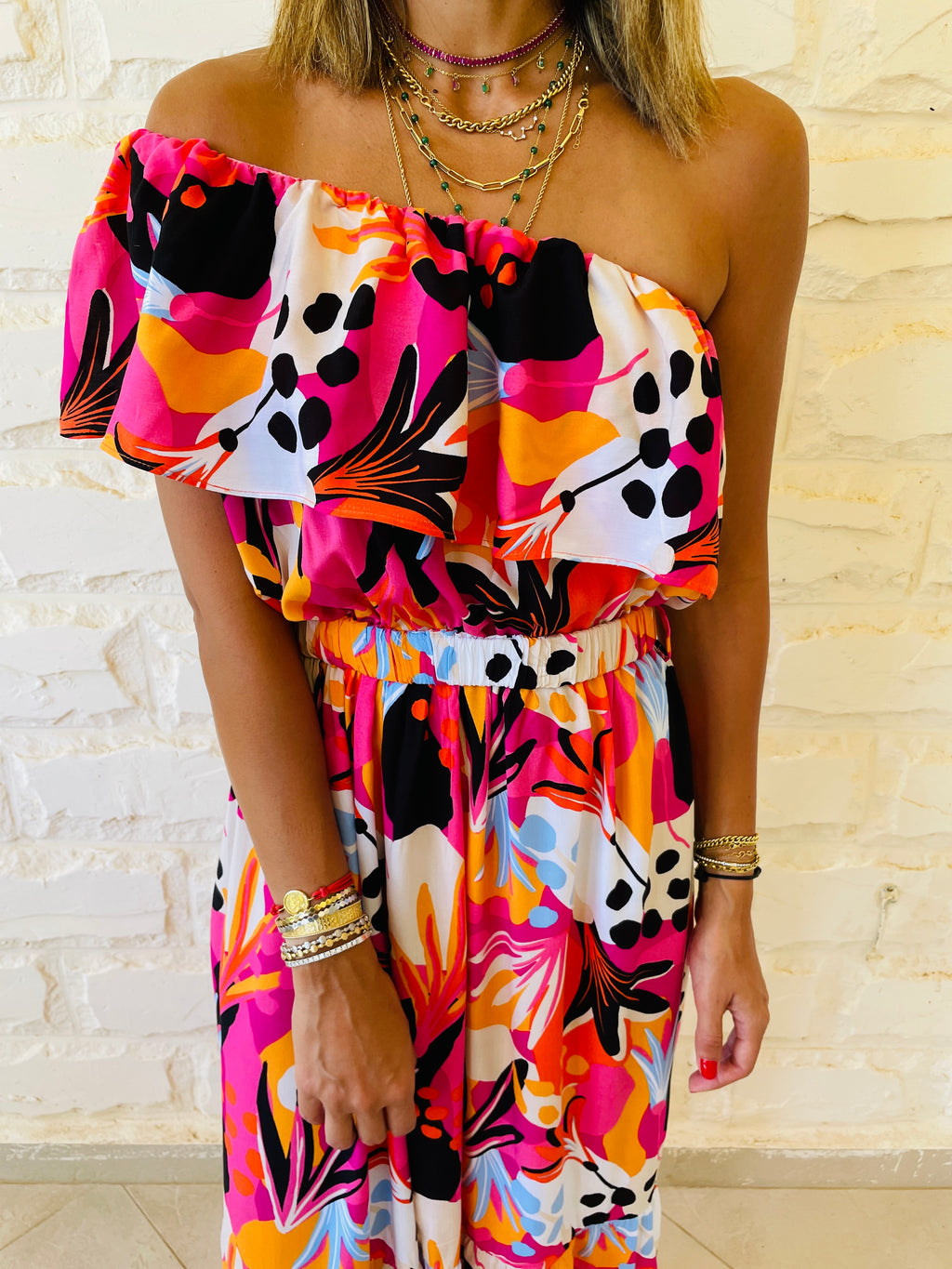 Fuchsia One Shoulder Printed Dress